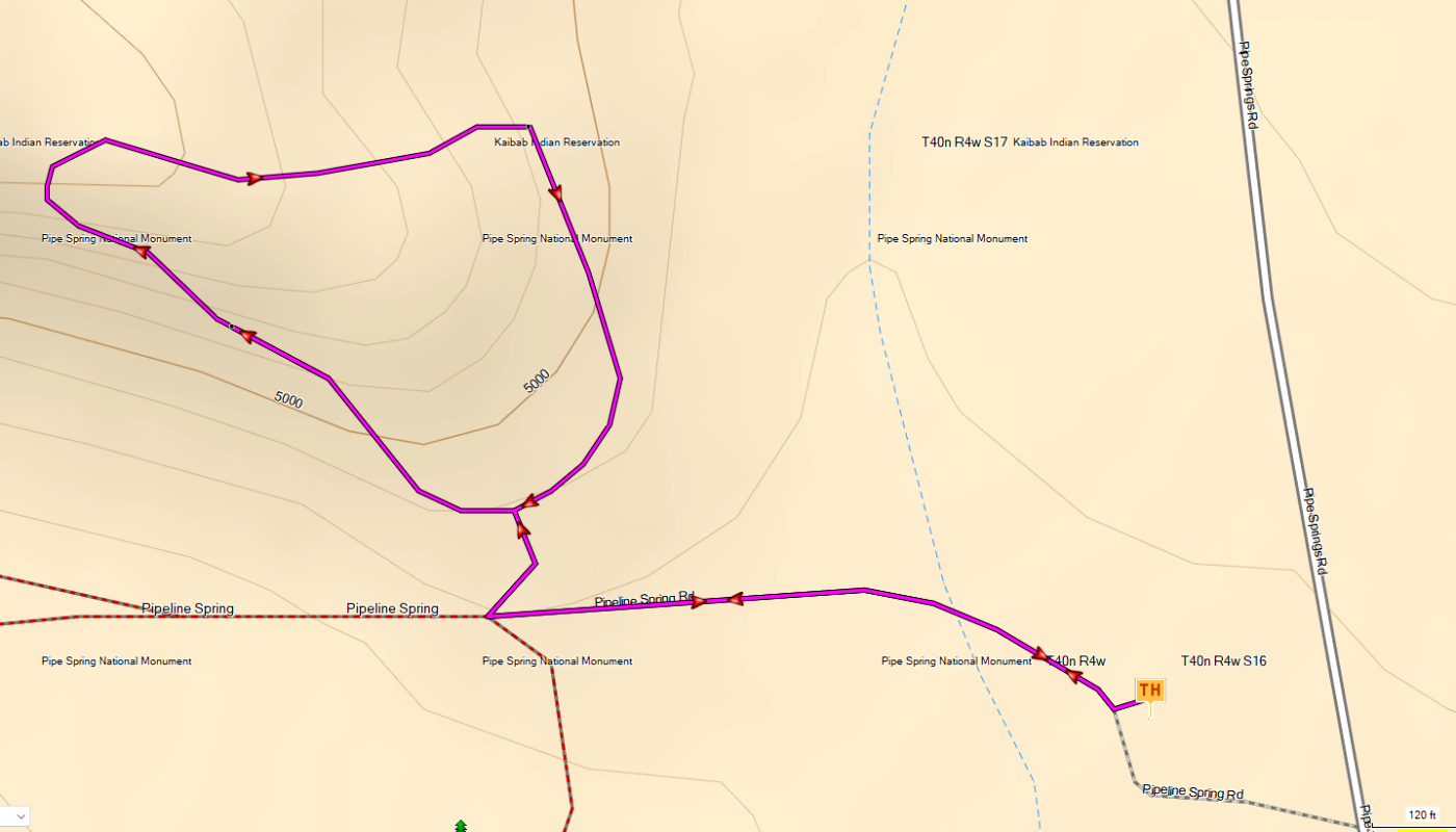Rating: ☆☆ Location: Pipe Spring NM Near: Fredonia, AZ Trail(s): Ridge Trail Trailhead: 36.86256, -112.73745 Total Distance: 0.5 mi Elevation Change: 130 ft Style: Lollipop Last Hiked: 13-Sep-08 Notes: Short - Plain - The Spring